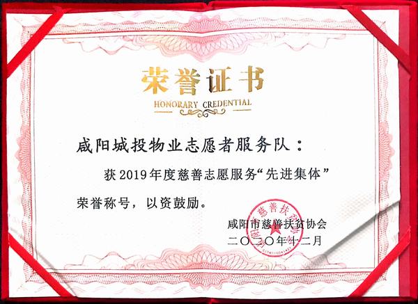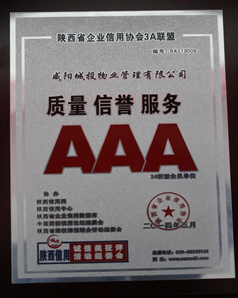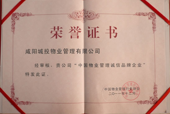 十年磨劍,劍成峰。2011年被中國物業(yè)管理行業(yè)協(xié)會授予中國物業(yè)管理誠信品牌企業(yè),2014年榮獲陜西省企業(yè)信用協(xié)會3A聯(lián)盟會員單位,2014年在國家園林城市創(chuàng)建工作中被咸陽市委、市政府評為“先進基層單位”,2012年-2017年連續(xù)5年被上級工會授予“先進集體”,2015年被共青團咸陽市委授予“青年文明號”標兵單位,2015-2017年連續(xù)3年被咸陽市扶貧協(xié)會授予“先進集體”“會員單位”稱號,2017年度被咸陽市總工會授予“咸陽市模范職工之家”稱號。