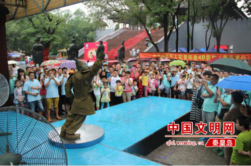 2016年7月7日,記者來(lái)到秦皇求仙入海處。在求仙殿廣場(chǎng)的東南方舞臺(tái),伴著富有節(jié)奏感的音樂(lè)響起,“泡泡大叔”的街舞表演準(zhǔn)時(shí)開始。他穿著皮質(zhì)的兵馬俑服裝,蹬著黑色軍靴,臉上涂滿灰色油彩。只見(jiàn)他雙腳不動(dòng),雙手舞動(dòng)前伸,身體前傾與地面成45度。固定幾十秒后,身體慢慢復(fù)位站直,又隨著音樂(lè)跳起了街舞。大約半個(gè)小時(shí)后,汗如雨下的“泡泡大叔”沖到電扇前吹風(fēng),一口氣喝下2瓶藿香正氣水,又跑回舞臺(tái)繼續(xù)表演。