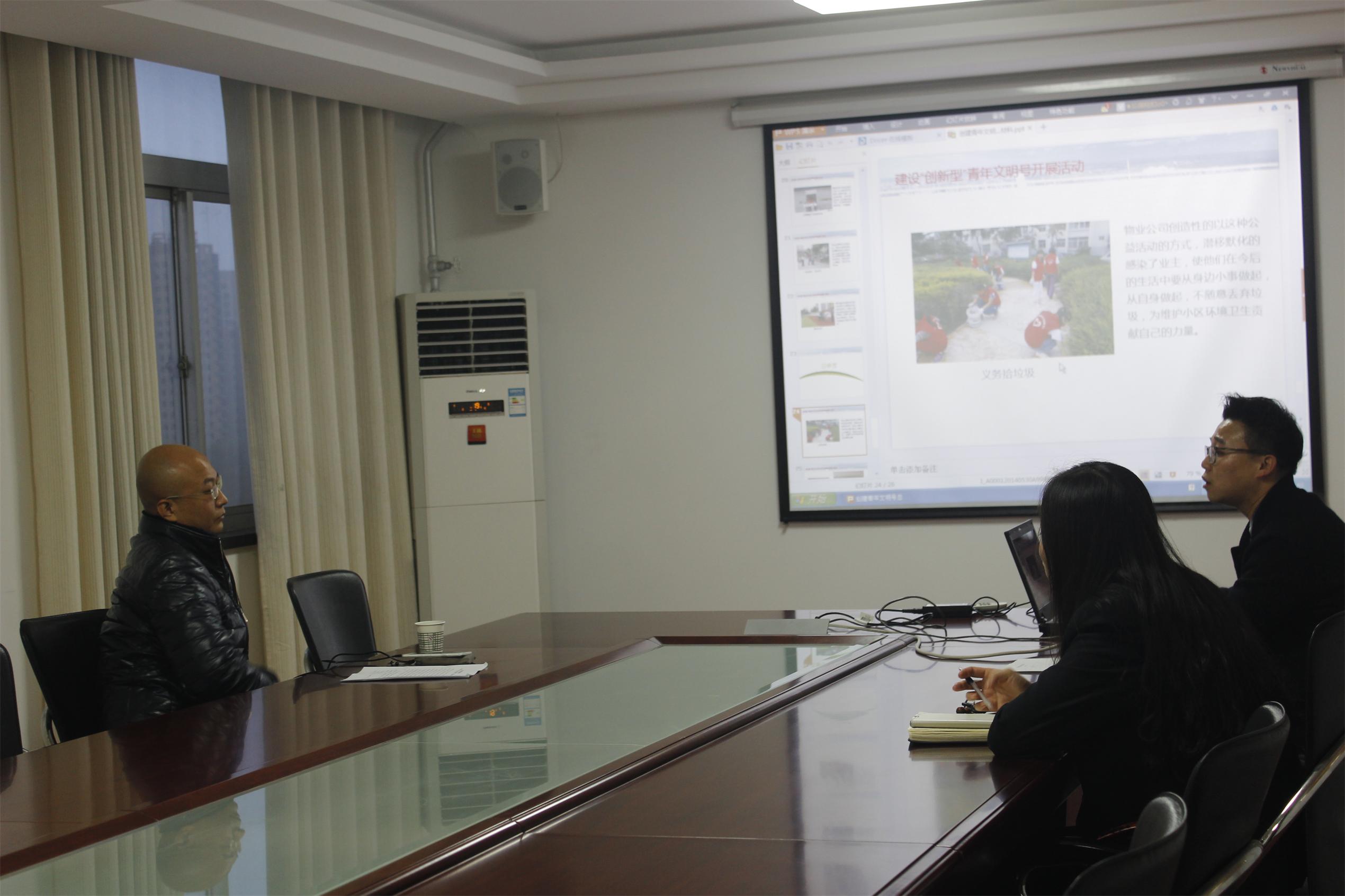 物業(yè)公司工會主席常紅艷,團支部書記王崇屾代表公司干部員工對顧李斌一行的到來表示熱烈的歡迎。隨后王崇屾代表創(chuàng)建小組向檢查組匯報了物業(yè)公司近一年來創(chuàng)建工作的開展情況,匯報后,檢查組又對物業(yè)公司創(chuàng)建工作的有關(guān)資料和宣傳設(shè)施進(jìn)行了檢查。